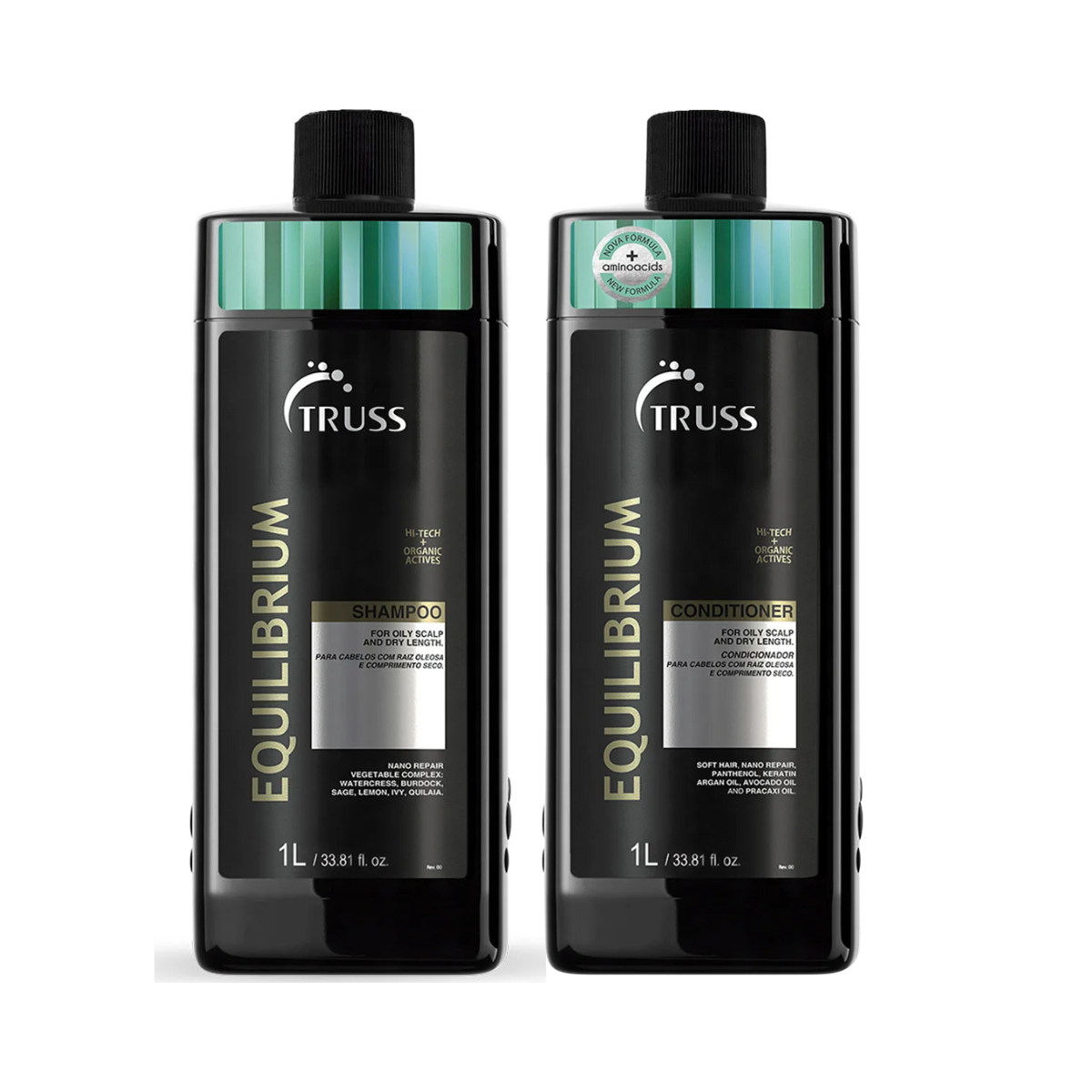 Descrição: A linha Equilibrium TRUSS foi desenvolvida especialmente para quem possui raiz oleosa e pontas secas. Seu shampoo limpa profundamente sem ressecar, regulando a oleosidade e cuidando do couro cabeludo. O condicionador hidrata, reduz o frizz e melhora a resistência dos fios, equilibrando o cabelo da raiz às pontas.
